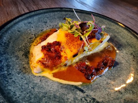 Bacalao confitado con patata panadera y salsa española